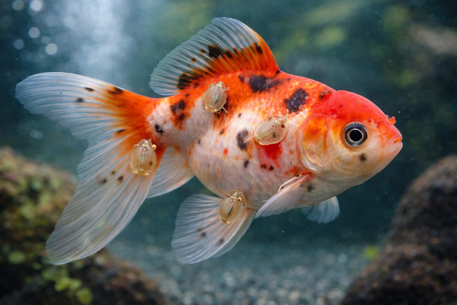 数ミリ程度の丸い円盤状の虫がくっつき、金魚の血を吸う病気です。